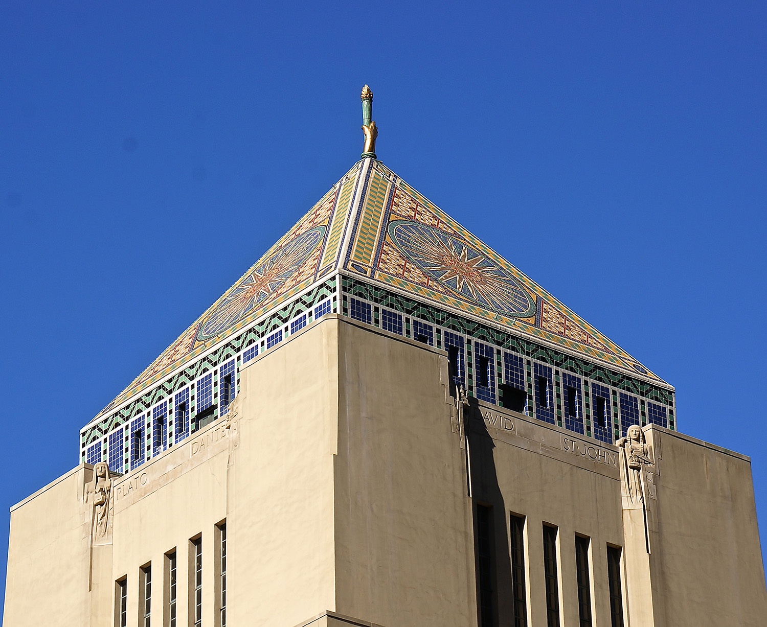 The Central Library is an early example of Art Deco, the transitional modernist style popular from the mid 1920s through the 1930s. Its monumental simplicity serves as a backdrop for an ambitious program of decorative sculpture. Bertram Goodhue agreed with the traditional assumption that referencing history and culture through art adds a valuable intellectual dimension to public buildings. Thoroughly integrated into the base of the tower and three facades, groupings of high and low relief sculpture impart a unique character to the Goodhue Building’s exterior.