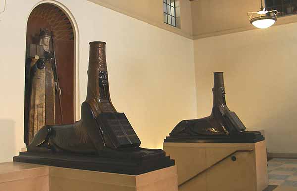 As part of a preservation agreement, the courtyard that had been next to the children’s department in the demolished East Wing was reproduced during the library renovation. This meant that elaborate tiled planters and important sculpture by Lee Lawrie could be saved and placed again in something approximating their original context. The rest of Lawrie’s sculptures preserved from the East Wing have been mounted in the Taper Auditorium lobby.
