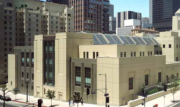 The Richard J. Riordan Central Library in downtown Los Angeles is both a leading public research library and a major architectural landmark. Comprised of the original 1926 library now called the Goodhue Building and a 1993 addition named for former mayor Tom Bradley, it ranks with the Bradbury Building and Union Station as a treasure of the city’s historic downtown. The library has been designated a Los Angeles Historic Cultural Monument (#46) and is listed in the National Register of Historic Places. Free docent tours of the building and its art are given every day the library is open, and on Saturday there is a tour of the Maguire Gardens which surround the library.