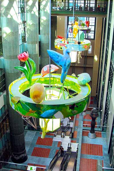 In the atrium two major artworks deal with light in ways both functional and metaphorical. Three massive chandeliers created by Therman Statom are suspended from the ceiling’s apex and dominate its upper space. Eighteen ft. in diameter and incorporating bright color applied in an expressive style, they symbolize the natural, technological and metaphysical spheres of existence.