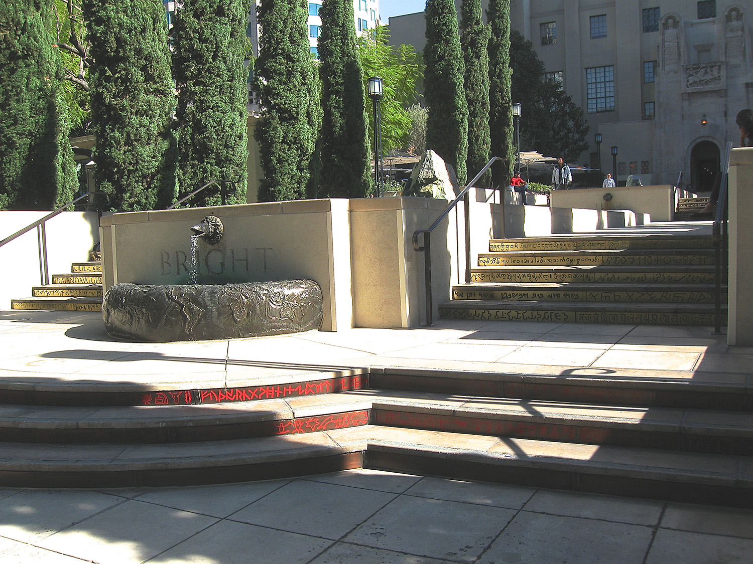 Spine, created by sculptor Jud Fine, layers a new work of art on the basic format of steps and pools recreated from Goodhue’s original design. It draws two meanings from its title. There is spine as mediator between brain and body, here alluded to by an evolutionary sequence from fish to amphibian to bird. But the dominant reference is to the spine of a book. As intended by the artist, the artwork lies in front of us like an open volume, the stairs functioning as pages. Moving from the bottom to the top, each step riser contain quotations in languages that collectively span the globe, written from earliest history to modern times.