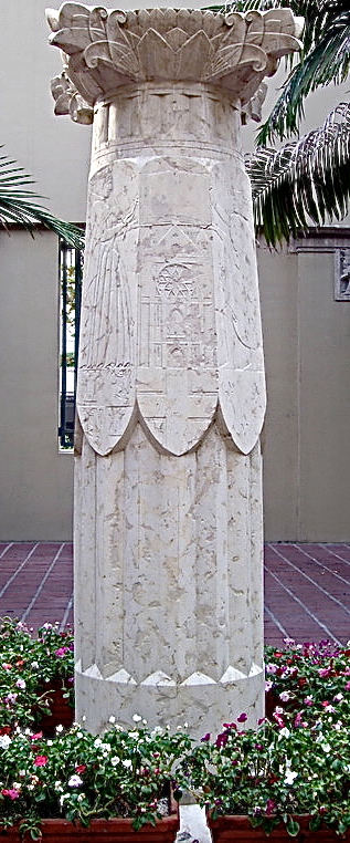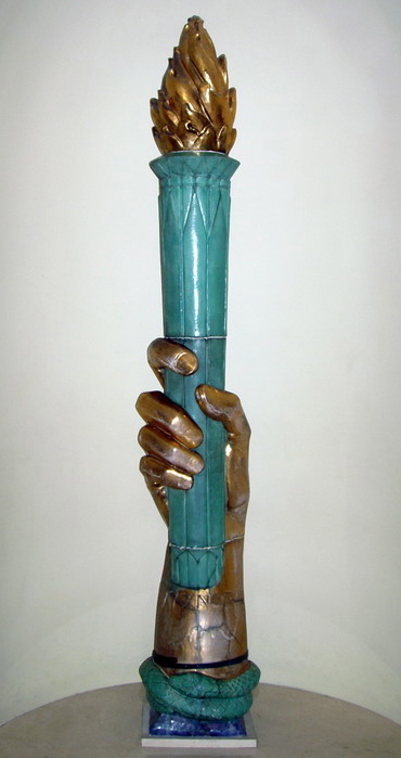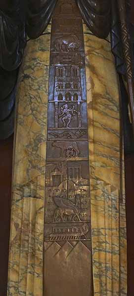 A copper panel superimposed on the sculpture represents the history of civilization in pictographic images running from bottom to top: the pyramids for Egypt, a ship of the Phoenicians, the Winged Bull of Babylonia and a tablet bearing the Ten Commandants, the Lion Gate of Mycenae and the Parthenon for the archaic and classical Greeks, Romulus and Remus for Rome, a dragon for China, the god Siva for India, Notre Dame for Medieval Europe, the Plumed Serpent Head for the Pre-Columbian Mayans, and a buffalo, covered wagon and the Liberty Bell for the United States.