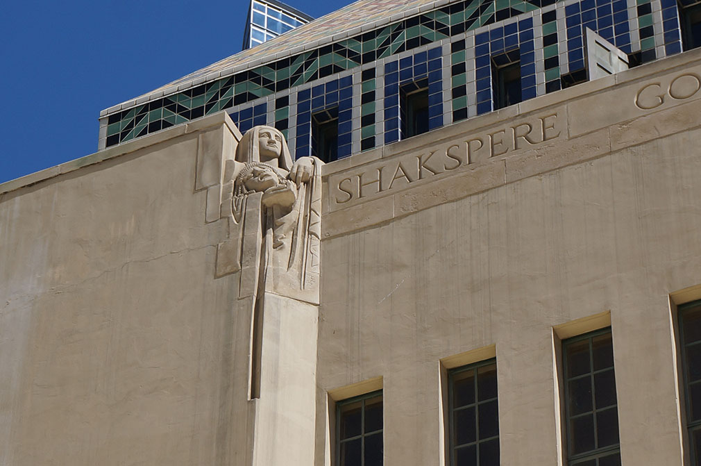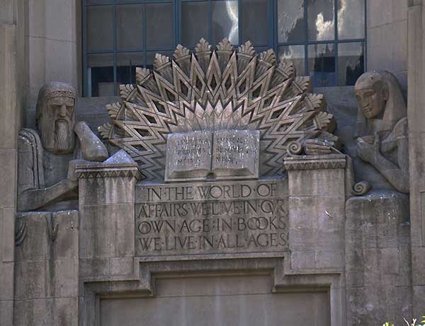 While the Goodhue Building’s concrete shapes look forward to the streamlined architecture of the 1930s and 40s, an aspect of its design harks back to the 19th century. The original Central Library was a “literate building”, meaning that it was decorated with an extensive program of symbolic sculpture and uplifting inscriptions. Goodhue’s library had in common with any number of buildings inspired by the City Beautiful ethos the aim of using art to inculcate the public, particularly new immigrants, with appropriate ideals and values. As one moves around the building’s exterior, the art and inscriptions celebrate the library’s function as both storehouse of knowledge and guardian of high culture.