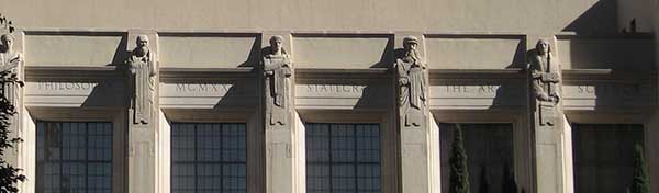 The Flower Street facade exemplifies the sophistication of Professor Alexander’s layered program of linked symbols. At the facade’s upper edge appears the last line of a passage in Latin from Lucretius Book 11:79: ET QUASI CURSORES VITAI LAMPADA TRADUNT which freely translated says, “Like runners they bear on the lamp of life.” Directly below a relief of horsemen passing a torch embodies the quote. The remainder of the facade carries out the theme of illumination. Two monumental sculptural figures, Phosphor and Hesper, personify the morning and evening stars. Beneath each figure’s feet, emblematic representations of sunrise (associated with Phosphor) and sunset (Hesper) suggest the cardinal points East and West. This abbreviated set of symbols in turn expands to suggest a whole history of knowledge engraved on scrolls listing great writers and thinkers divided between East (Asia and the Middle East) and West (classical cultures and Europe).