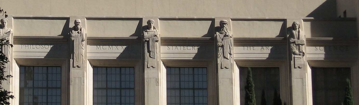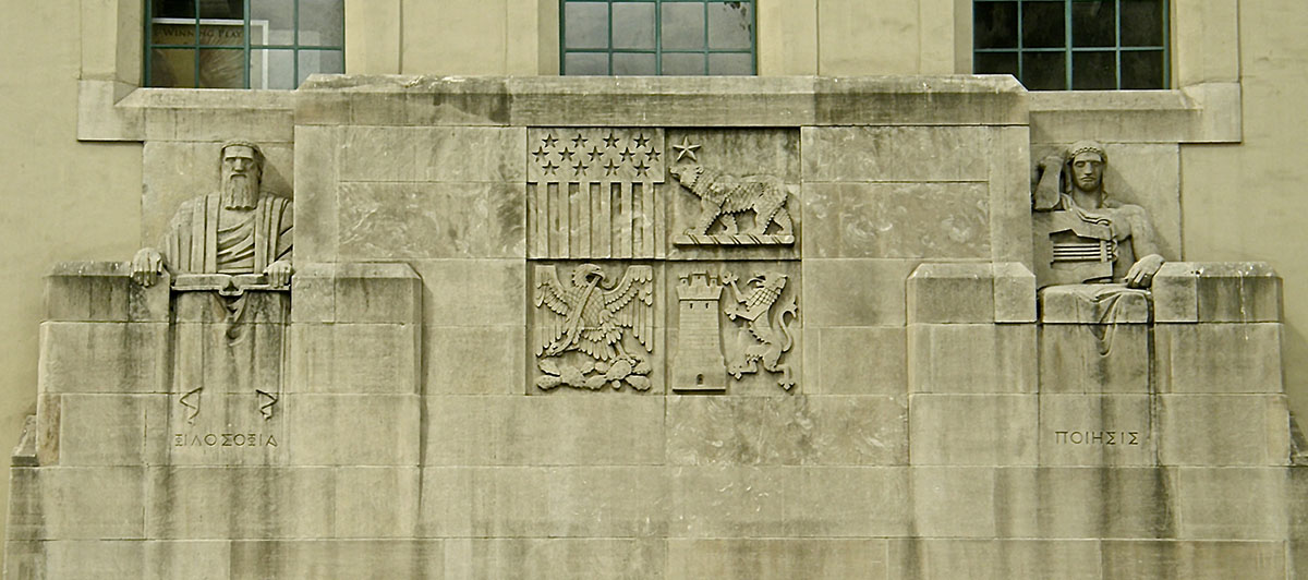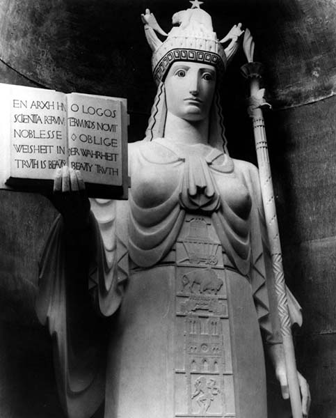 The system of meaning that organizes the exterior and to some extent interior art of the library was conceived by University of Nebraska philosophy professor Hartley Burr Alexander who first collaborated with Goodhue on the Nebraska state capitol building. Although Goodhue generally devised iconographic themes for his buildings, his initial plans for the capitol had been widely criticized for a lack of focus on Nebraska’s state history. At that point, the architect realized he needed help and was persuaded to take on Nebraska native Alexander as an associate.