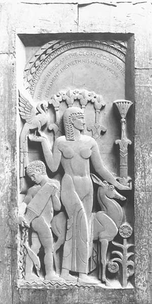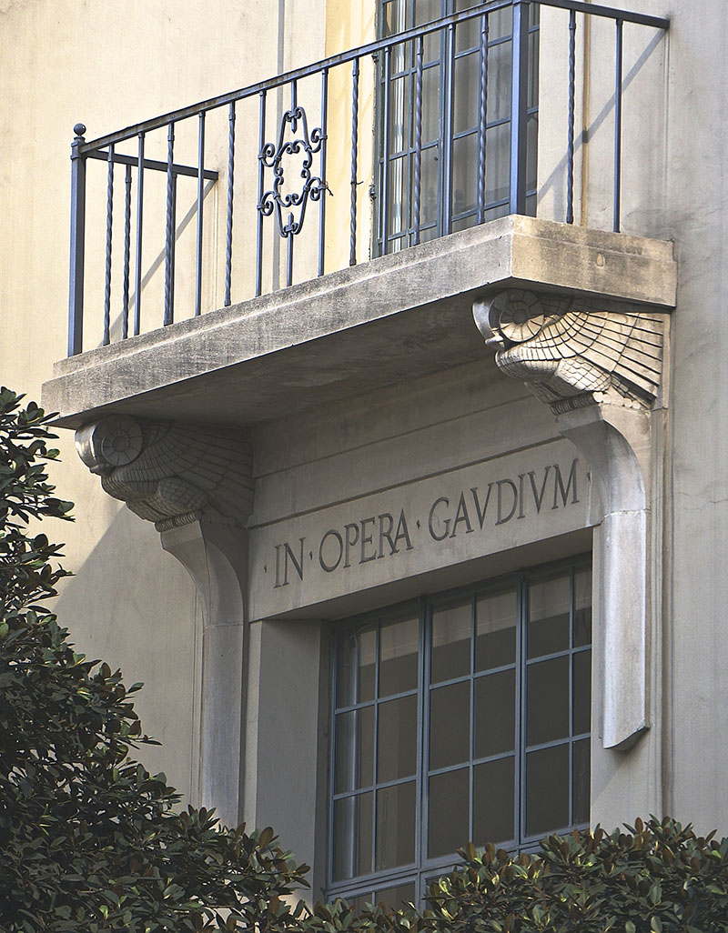 The two relief panels that originally framed the doorway to the Music and Art departments represent figures from ancient Greece (for music) and Egypt (for art). The panel for music bears a quotation from Job 28:1 "The morning stars sang together and all the sons of god shouted for joy.” The panel representing art carries a quotation from Psalms 19:1 “The heavens declare the glory of god and the firmament sheweth his handiwork." Above the doorway was an inscription paraphrased by Alexander from Plato’s Phaedrus: “Love of the beautiful illuminates the world.”