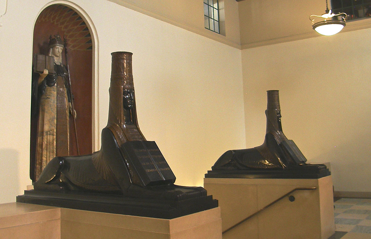 In Alexander’s 1927 guidebook essay, he interpreted Goodhue’s choice of Sphinxes as representing the limits of human knowledge, the “darkness to which the light has not penetrated and to which it may never be expected to reach.”