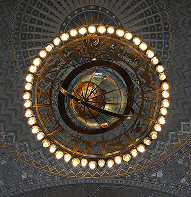 The Rotunda contains no sculpture--it is decorated with stenciled patterning and murals--but there is a large bronze chandelier modeled by Lee Lawrie that presents both symbols and decorative motifs relating to the Light of Learning theme. Nine feet in diameter, its outer edge is rimmed with 48 light bulbs signifying the (then) 48 states. Signs of the Zodiac are distributed around the inner rim, and in the center is suspended a glass globe painted with representations of the oceans and continents. The support chains are decorated with a crescent moon and stars and the whole is suspended from a painted sunburst that marks the center of the dome.
