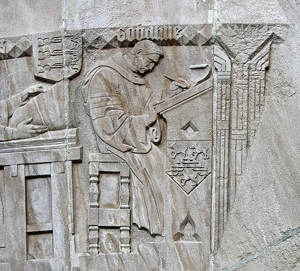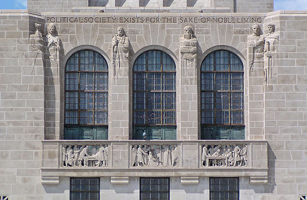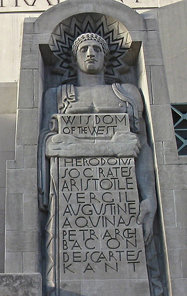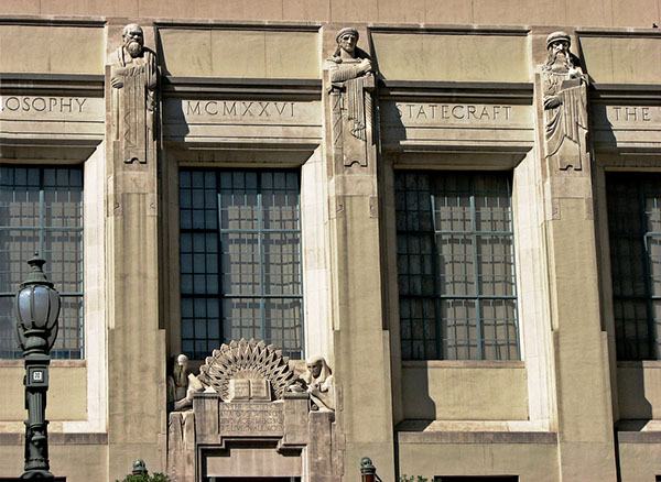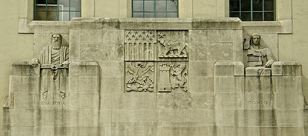 The Hope Street facade presents true portraits of famous thinkers linked to categories of knowledge. Six elegantly articulated pilasters run between the high windows of the main reading room and overlap a simple entablature, each culminating in the bust of a great thinker who embodies a category of knowledge. One’s eye travels up from subtle shallow carved drapery into deeply carved, crisply detailed individual heads, each with distinctive features that imply portraiture. Lawrie employed simple, faceted shapes that read easily from a distance and convey an air of dignity and universality.