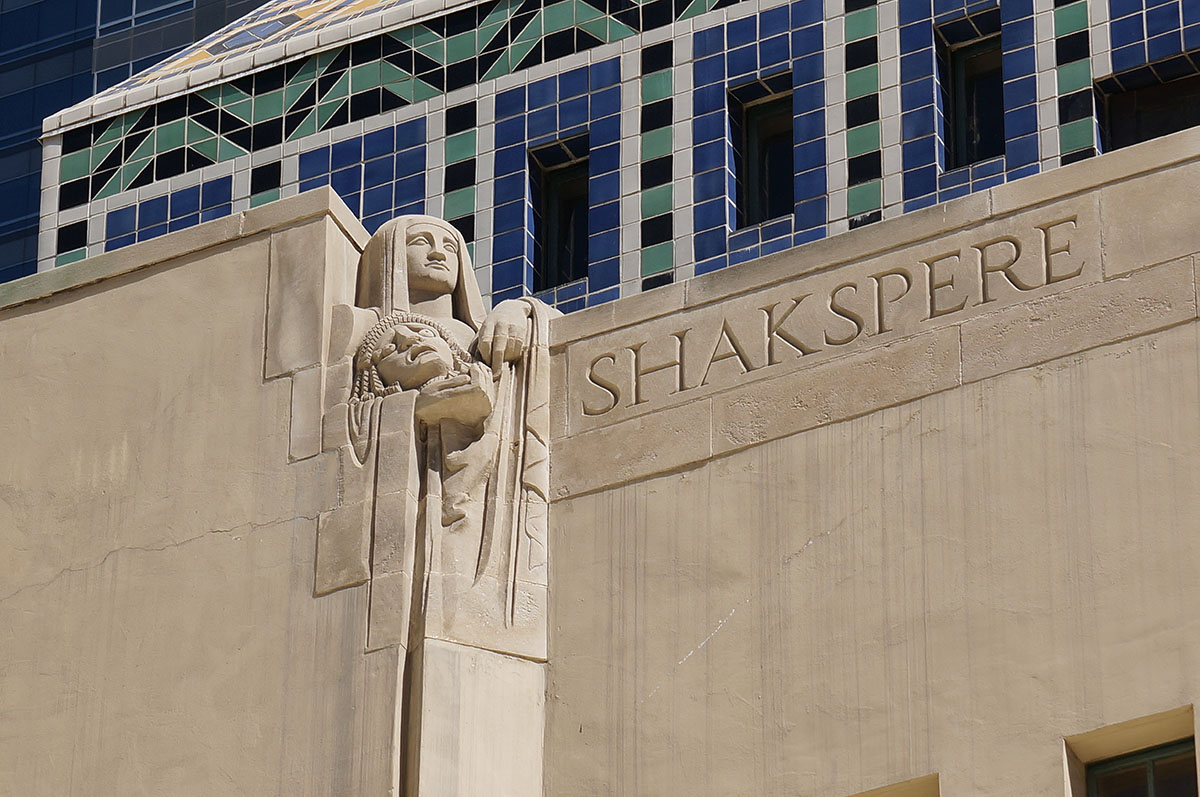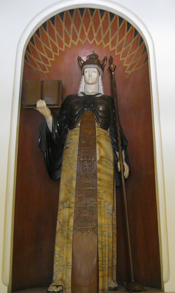 The north (Fifth Street) entrance is almost flush with the sidewalk and quite shallow but with the subtle detail that was such a strength of Goodhue’s designs. Like the Flower Street entrance, its shape recalls ancient mortuary temple entrances, an effect seconded by the attached sculptures of the Philosopher and the Poet whose cubic forms merge with the limestone surface. Framed by the portal’s edges, they resemble rigidly posed Egyptian funerary sculptures and, flanking the seal of Los Angeles, endow it with an air of timeless monumentality.