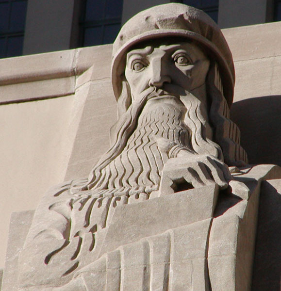 All of the sculpture on the exterior and interior of the Goodhue Building was created by Lee Lawrie, a prominent member of the last generation of American sculptors to practice the traditional art form of architectural sculpture. German by birth, Lawrie immigrated to the United States with his widowed mother and grew up in Chicago. Apprenticed as a teenager to sculptor Henry Park, he became part of the team of artisans who produced the elaborate program of Beaux-Arts style statuary for the Worlds Columbian Exposition held in Chicago in 1893.