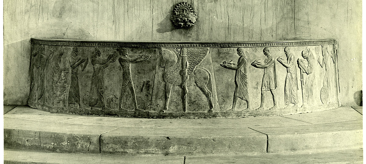 Lawrie modeled another subtly detailed relief for a low basin that served as a terminus point for the West Garden’s water feature. Three rectangular pools flanked by low steps and cypress trees stretched from the west entrance to the street. At the end of each pool, a runnel allowed a trickle of water to fall into a semi-circular basin below. The largest lowest pool was sculpted in bronze by Lawrie who together with Hartley Burr Alexander devised a theme, The Well of the Scribes. Lawrie’s design centered on a winged horse symbolizing inspiration and on each side a procession of elegantly detailed single figures in profile representing scribes from various early cultures. The basin was removed when the West Garden was paved over in 1969, and for 50 years its whereabouts was unknown. In 2019, Alta magazine published a story about its disappearance. An antique dealer in Bisbee, AZ read the story and recognized a piece of the Well he had purchased 10 years earlier. The section of the Well was returned to Central Library, and the search for the remainder of the Well continues.