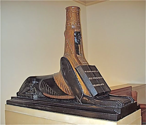 Lawrie had an intriguing sometime tendency to work within style idioms related to his sculpture’s subject matter. Probably suggested by a cult statue of Pallas Athena, Civilization is rendered in the stiffly archaic style of 6th century BCE Greek statuary, while the svelte elegance of the sphinxes seems to hover between New Kingdom Egypt and Art Deco. For these artworks meant to be seen close up in artificial light, Lawrie makes use of color: black marble and bronze for the sphinxes and two colors of marble, bronze and copper for Civilization. The workmanship on all three sculptures is exquisite and demonstrates why, when given the opportunity, Lawrie generally relied on a team of skilled craftsmen assembled by sculpture fabricator Edward Ardolino.