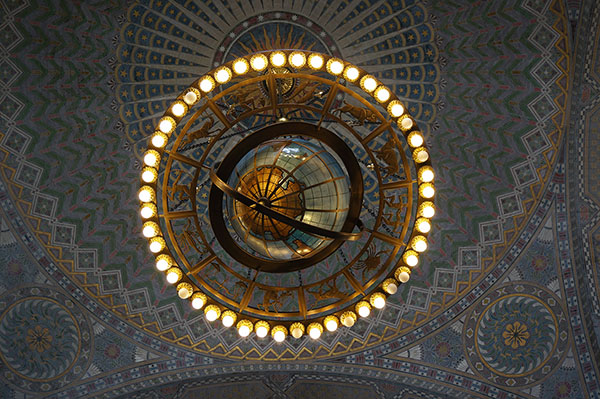 The chandelier, nine feet in diameter, is one of the Goodhue Building’s spectacular decorative features. Suspended on chains decorated with stars and crescent moon, it centers on a glass globe surrounded by signs of the zodiac which are framed by forty-eight lightbulbs.
