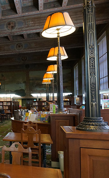 Lawrie’s elegant light fixture designs enrich the austere concrete-walled interior spaces. His table lamps mounted on tall stanchions added a graceful note to the long reading tables of the history department, mitigating the room’s somewhat cavernous quality. Placed on pedestals in that room which was renovated as the Children’s Department, precise reproductions function equally well today.