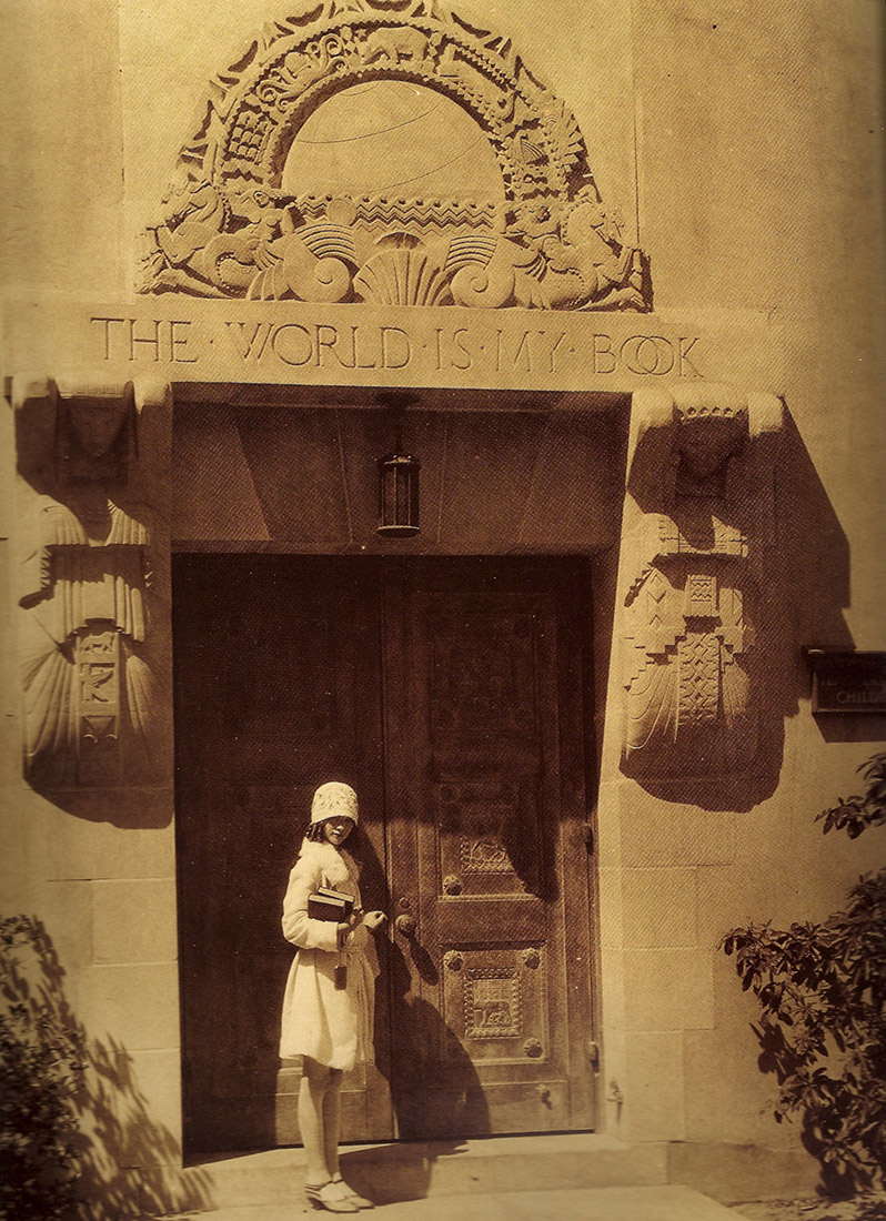 For the Children’s Department entrance and patio, Lawrie contrived a body of sculpture quite different in spirit from the rest of his work for Goodhue’s library. Inventive and playful, it suggests the heady joy of a child’s imagination connecting to the world of books. The lower level entrance was embellished with a magnificent surround. Caryatids support a lintel carved to read “The World is my Book” and above it is a sort of tympanum containing a variety of references to mythology and ocean voyages. Typical of Lawrie’s design sense, the intricately carved detail on both the caryatids and the tympanum is emphasized by the plain oblong lintel with its sober lettering style.