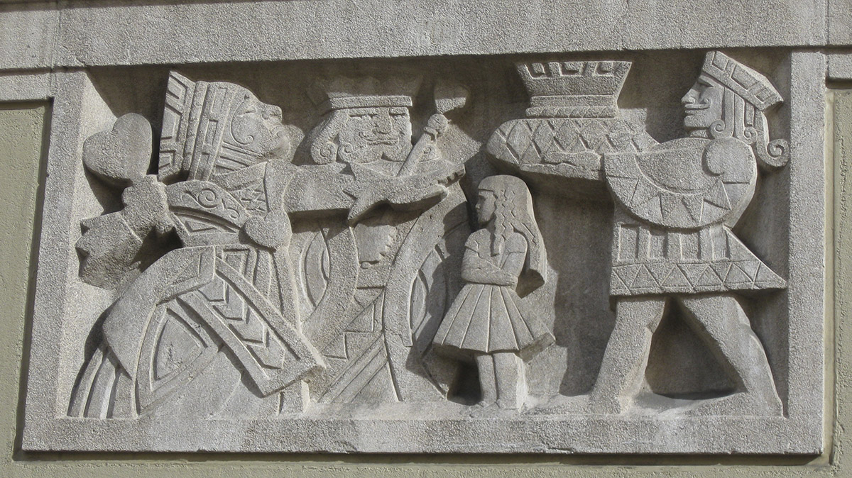 Relief panels depicting Alice and the Red Queen, the Cow Jumps Over the Moon and Robin Hood