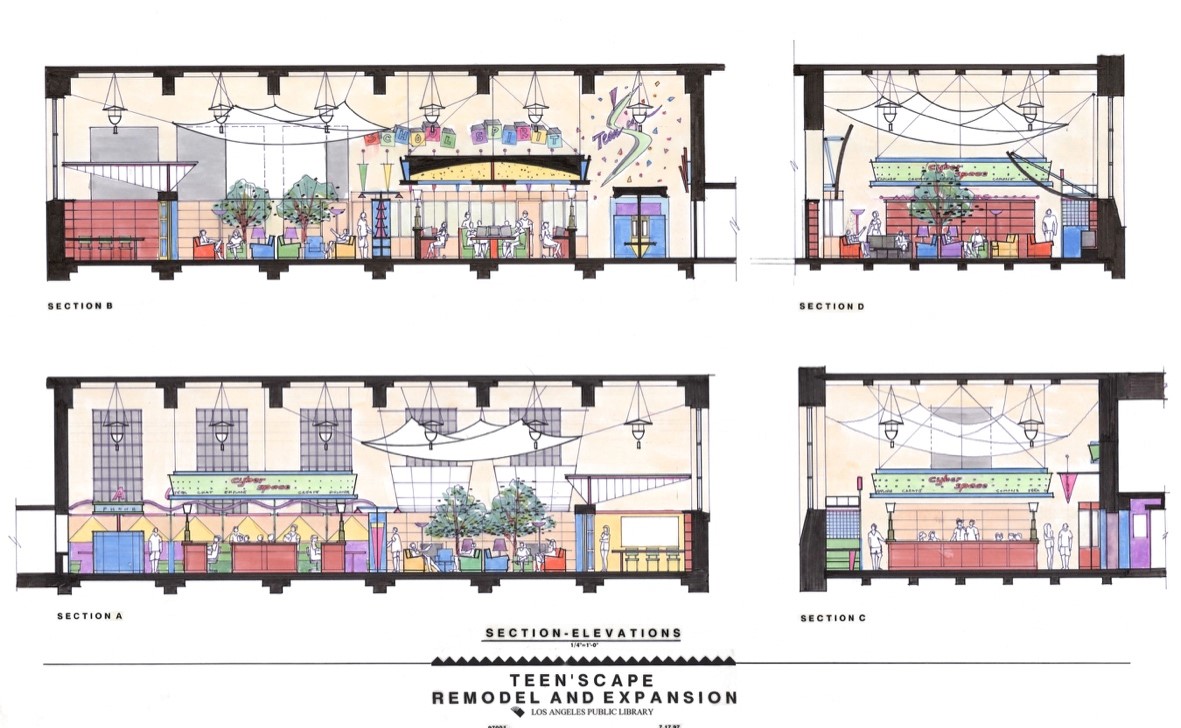 When you take our free docent-led art and architecture tours of the Los Angeles Central Library, we always point out Teen’Scape, one of the nation’s first libraries within a library designed by and exclusively for teens. The 4,000 square-foot area includes the “living room,” complete with sofas and 50” plasma TV, Cyberspace with more than 20 computers with Internet access, and a Homework Center featuring computers with Word, Excel, and PowerPoint. Opened in 1998, the unique space was created by Orange County-based architect Robert Coffee.