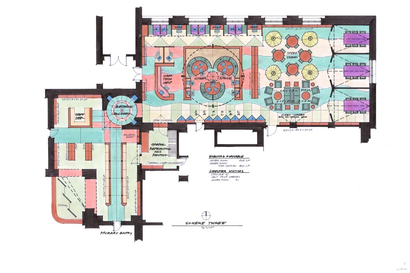The architect caught the eye of Assistant Library Director Pat Kiefer at a library conference in the mid-90s when he did a presentation on innovations in library design. Kiefer approached Coffee about creating a unique space for teenagers within the historic part of the newly renovated Central Library. She warned him that the budget was small, but Coffee, who had just started his own practice, was captivated by the opportunity.  He threw himself into a design proposal. Pat Kiefer then introduced Coffee to Georgette Todd, who quickly became his invaluable liaison, chief collaborator, and tireless champion.