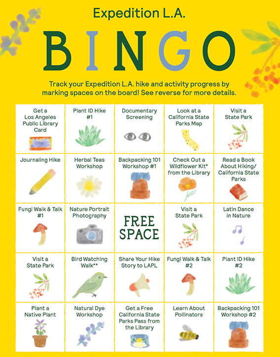 Track your Expedition L.A. hike and activity progress by marking the spaces on the printable bingo board!