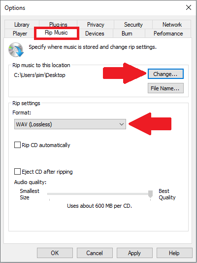 - Click the Rip Music tab. Under Rip music to this location you may select your storage device (USB or external hard drive) by clicking Change. Otherwise, files will save in the Patron Files folder on the desktop by default.