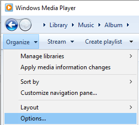 - Launch the Windows Media Player program. Click the Organize button in the top-left corner, choose Options.